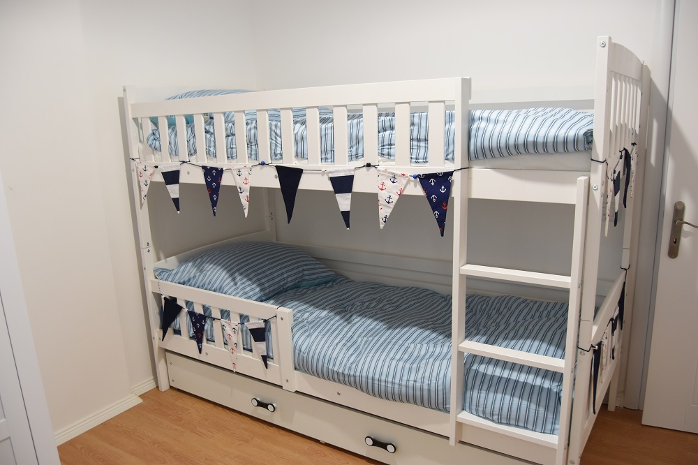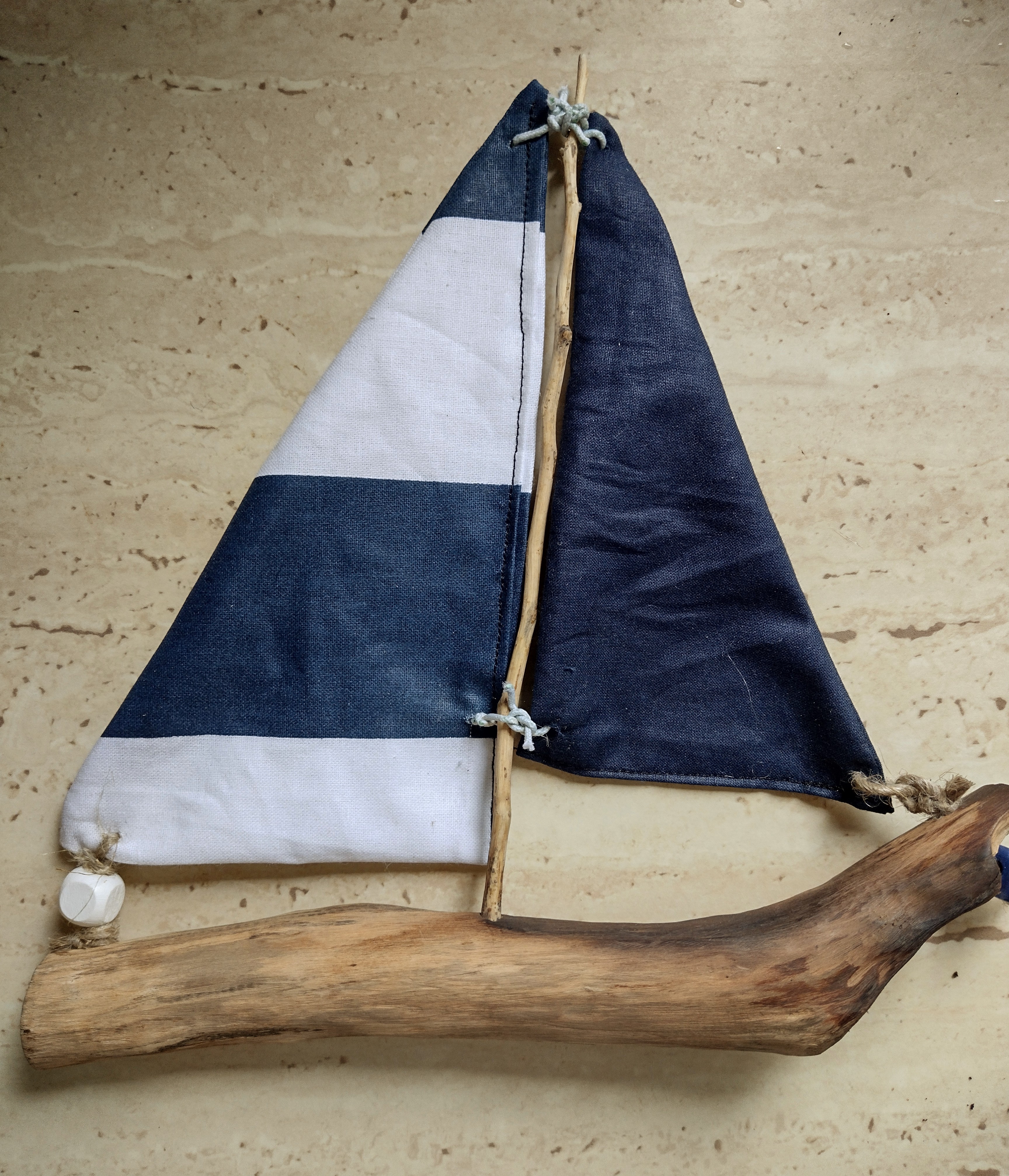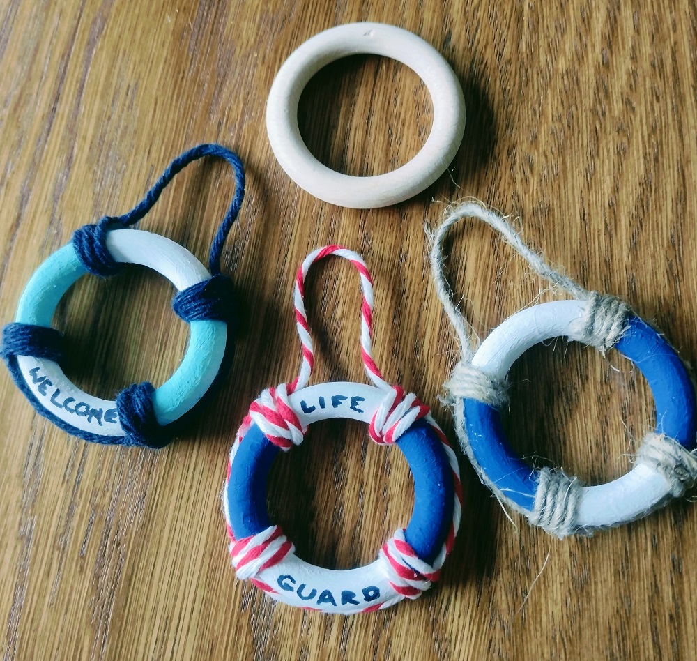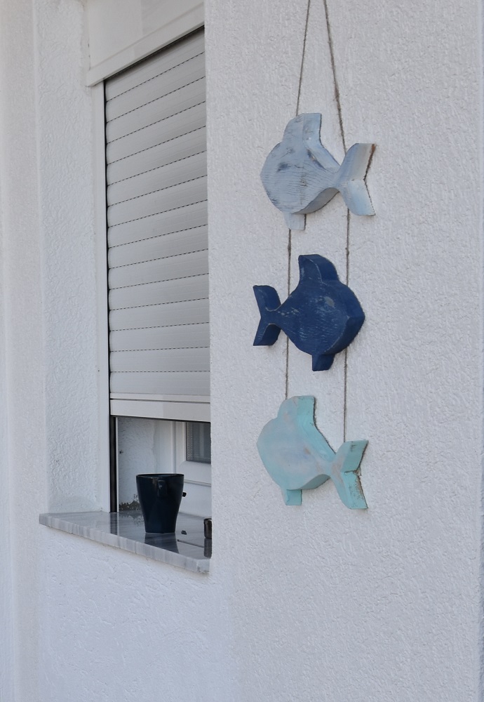 6. Mniejsze dekoracje jak np. koła ratunkowe, girlandy, rybki czy łódeczkę również wykonaliśmy samodzielnie. Koła ratunkowe np. przy latarni powstały z drewnianych kółek od karnisza. Girlandy uszyliśmy z marynarskich materiałów. A łódeczka to patyk wypłukany przez morze i drugi na maszt oraz dwa żagle z tych samych materiałów. Drewniane rybki na sznurku to również łatwy projekt do samodzielnego wykonania. Wystarczy wyciąć z drewna trzy jednakowe rybki. Wszystkie trzy są pomalowane na trzy różne kolory dwukrotnie i przetarte.