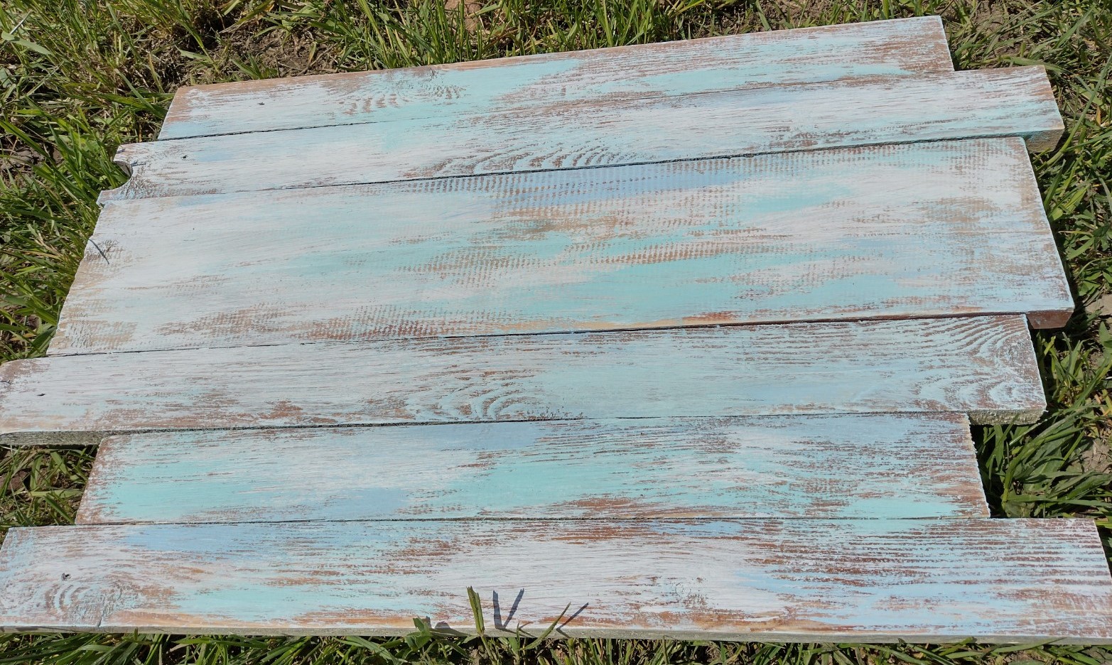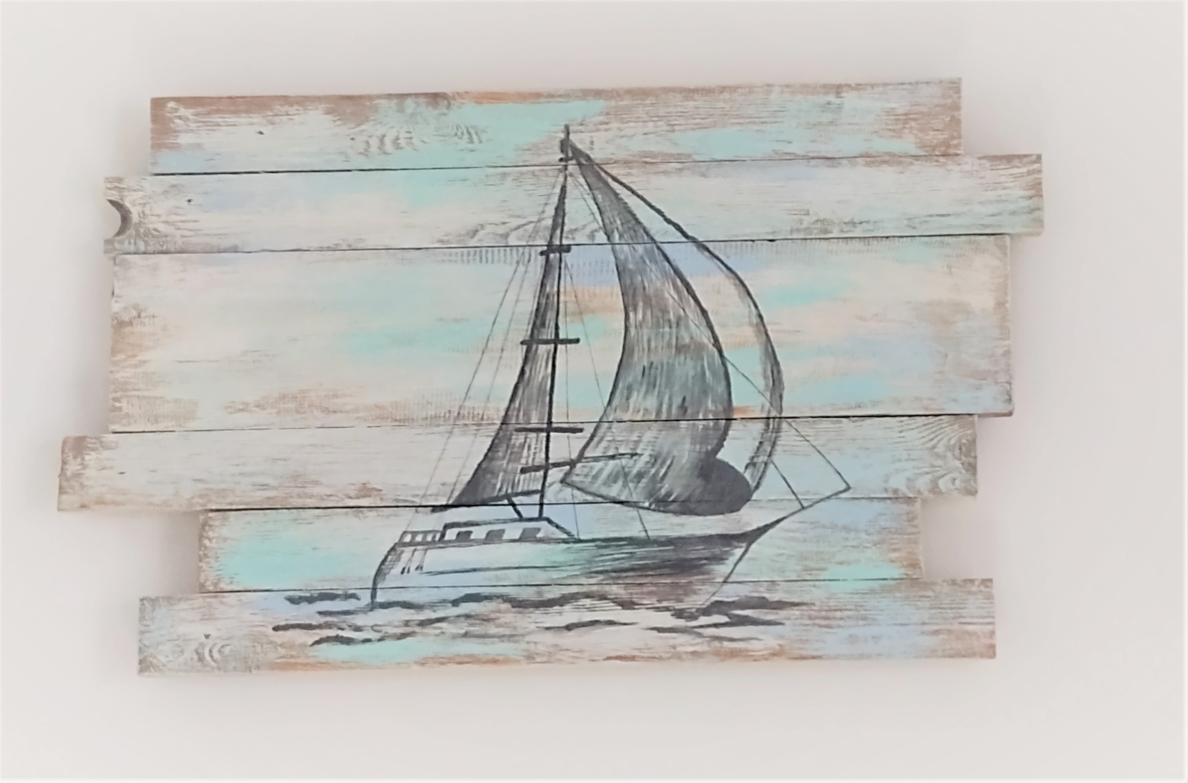 1. Dekoracja z łódką na deskach, a konkretniej obraz na deskach. W celu przygotowania takiego obrazu połączyliśmy ze sobą zwykłe deski, które następnie zostały wyszlifowane. Kolejny krok to tło. Użyliśmy farby kredowej białej, lazurowej i szafirowej nakładając je pędzlem techniką "gdzie popadnie";-) Aby osiągnąć zadowalający efekt po wyschnięciu całość została znowu przeszlifowana. Dzięki temu uzyskaliśmy bardzo ciekawy podkład do namalowania łódki. Gdzie niegdzie oczywiście wychodzą spod farby dechy. Łódka została namalowana farbę kredową w kolorze grafit tak, aby pasowała do zagłówka łóżka.