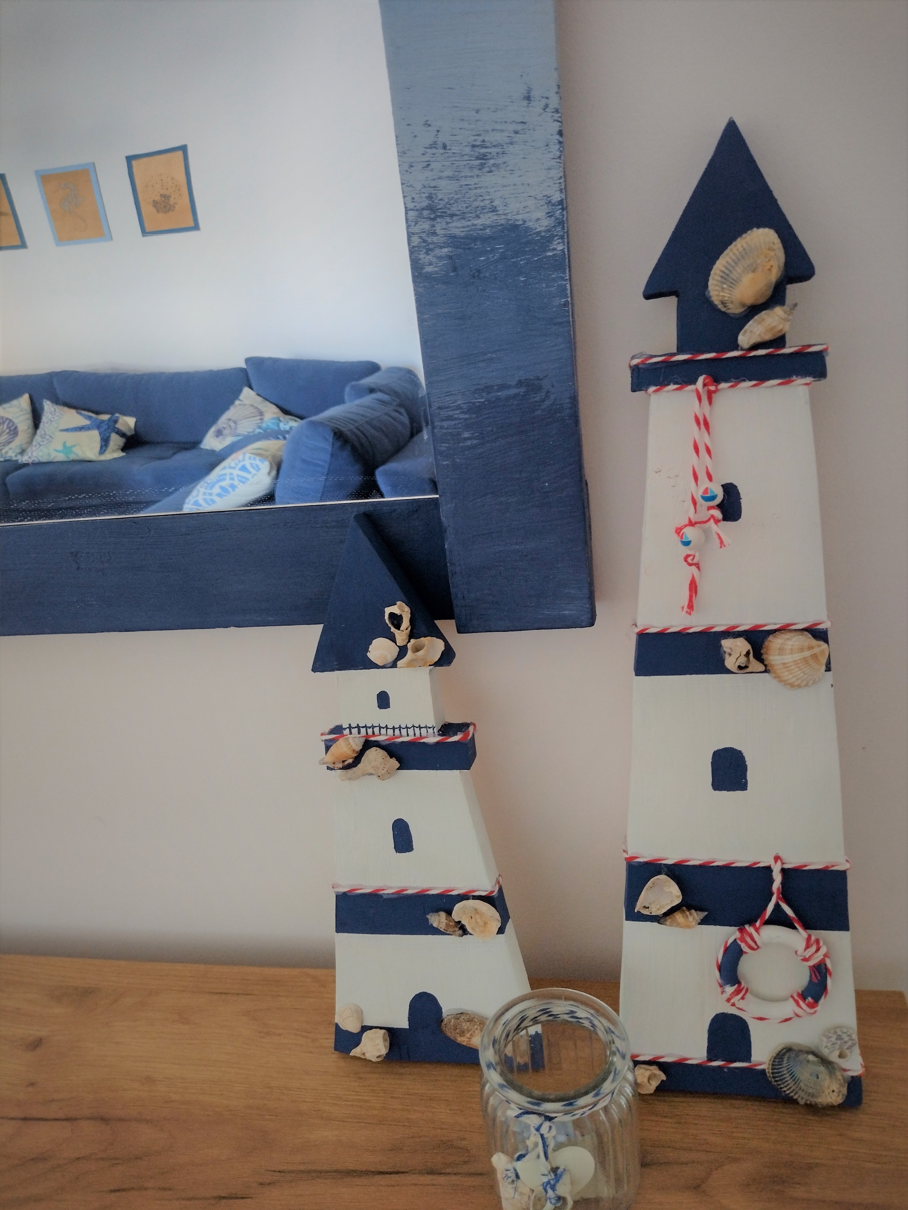 5. Latarnie morskie to dekoracja typowa dla marynistycznego wnętrza. Nasze dwie zostały wycięte w drewnie i pomalowane farbą kredową białą i granatową. Wykończenie latarni to przyklejony kolorowych sznurek oraz muszelki. Trzecia latarnia została wycięta ze stempla budowlanego i pomalowana na kolory pasujące do tła łódki z obrazka.