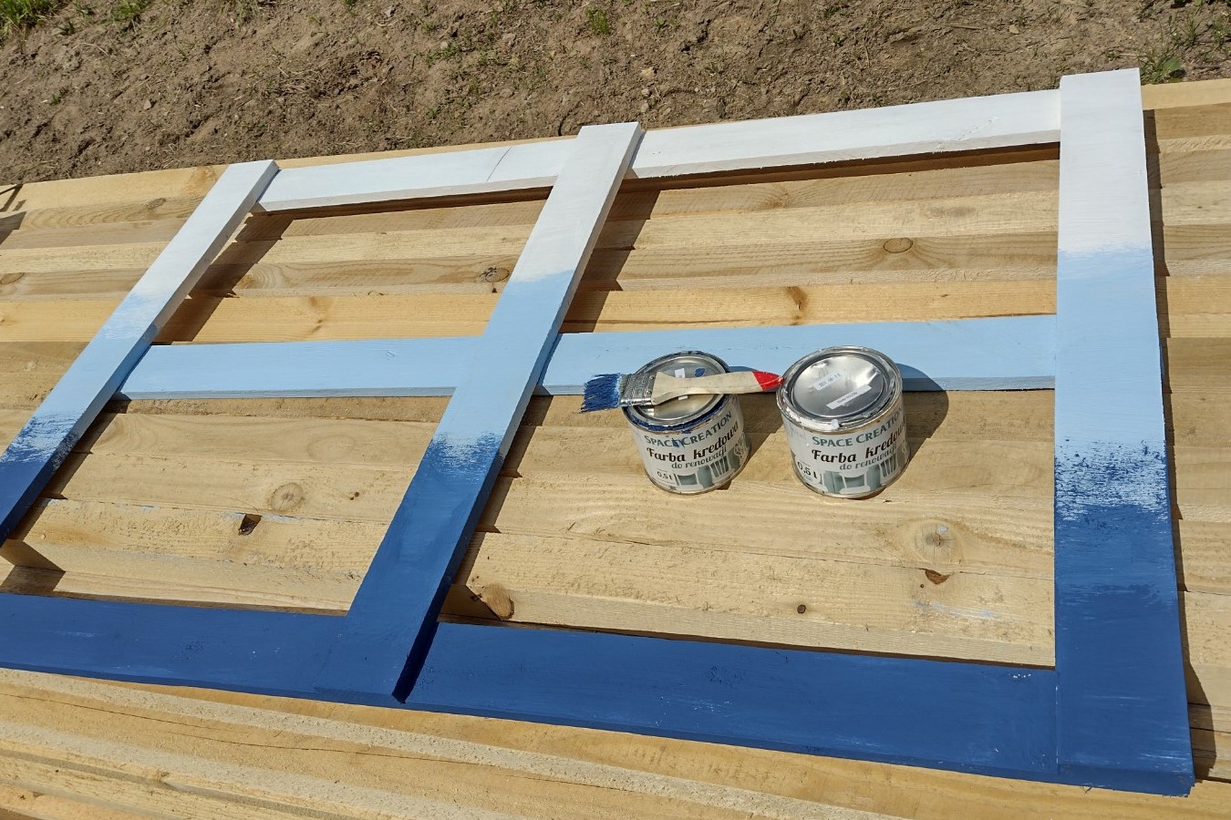 3. Lustro to nic innego jak rama z palety pomalowana farbą kredową w kolorze białym, szafirowym i granatowym. Po wyschnięciu dodane zostało bezpieczne lustro akrylowe, a całość zawieszona nad komodą.