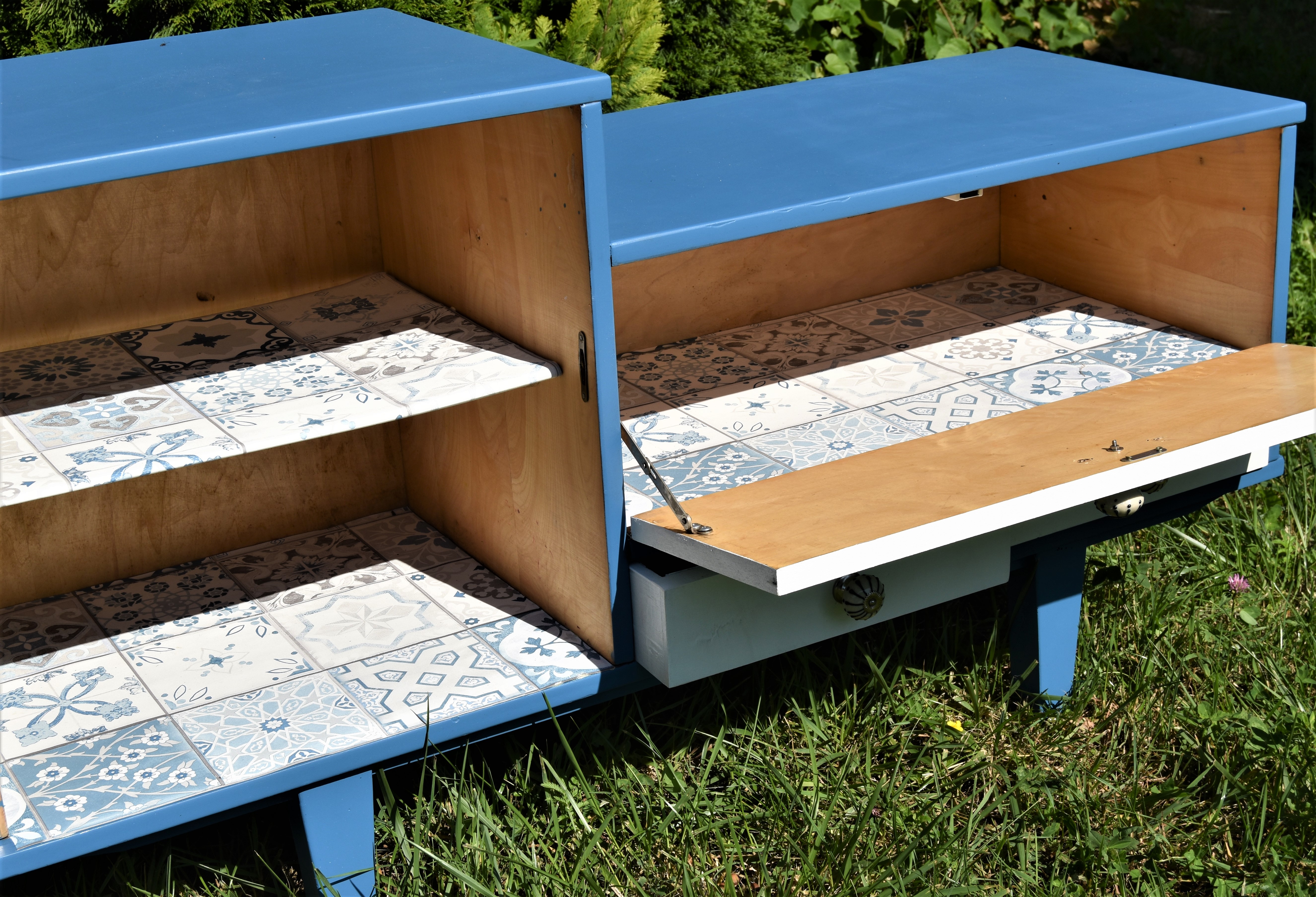 Krok drugi wnętrze. Po oczyszczeniu wyklejone zostało tapetą. Tapeta w biało-niebieski wzór pasujący do wspomnianych gałek i koloró korpusu.