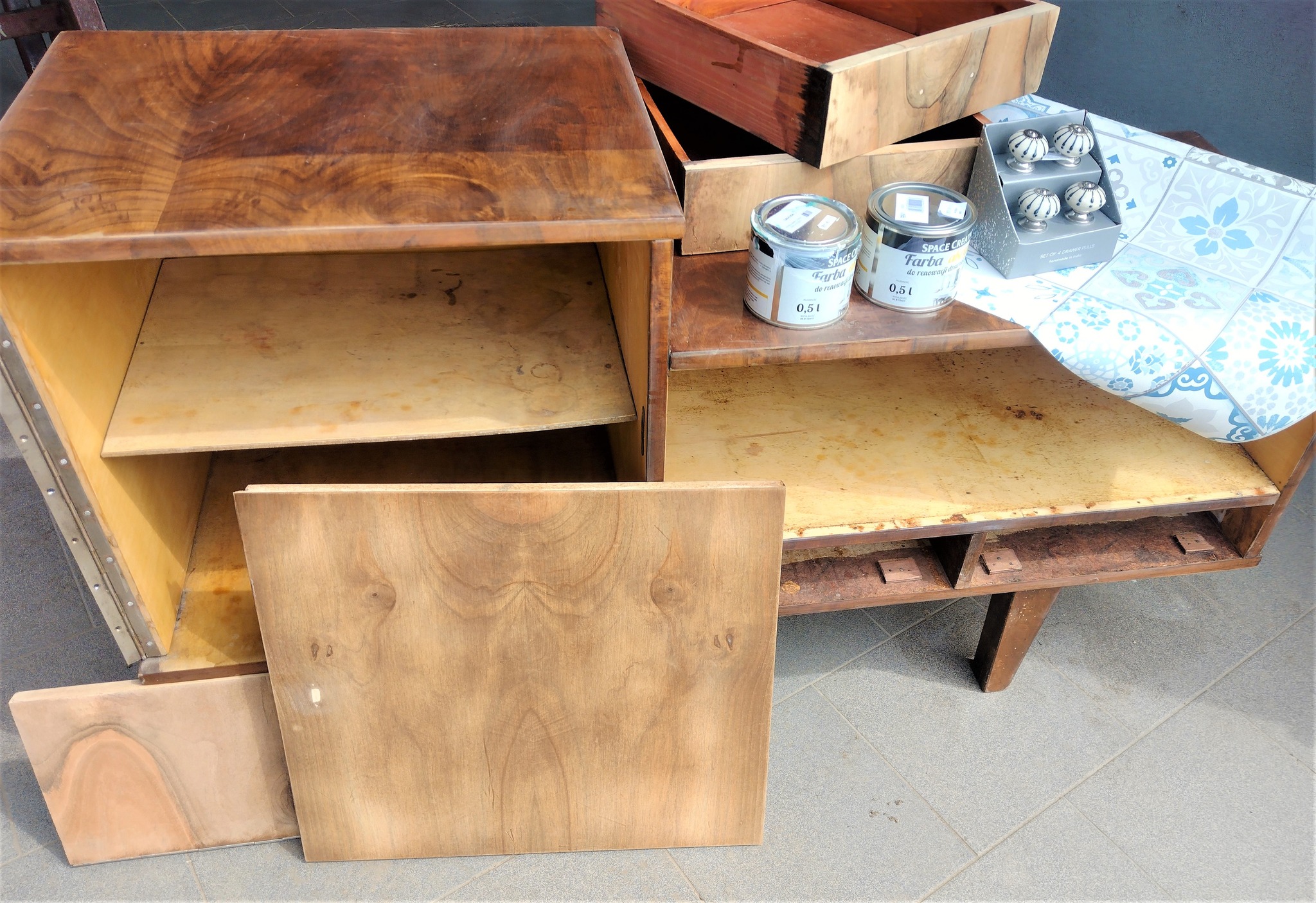 Krok pierwszy korpus. Malowanie farbą akrylową na kolor biały i niebieski było łatwiejsze po rozkręceniu szafki. Jak widać na zdjęciu powyżej do malowania na kolor biały zdjęte zostały stare warstwy farby, a drewno dokładnie wyszlifowane. O ile ciemne kolory pozwalają na kilka ustępstw w kwestii oczyszczania, o tyle z kolorem białym zdecydowanie lepiej jest dokładnie wyczyścić podłoże.